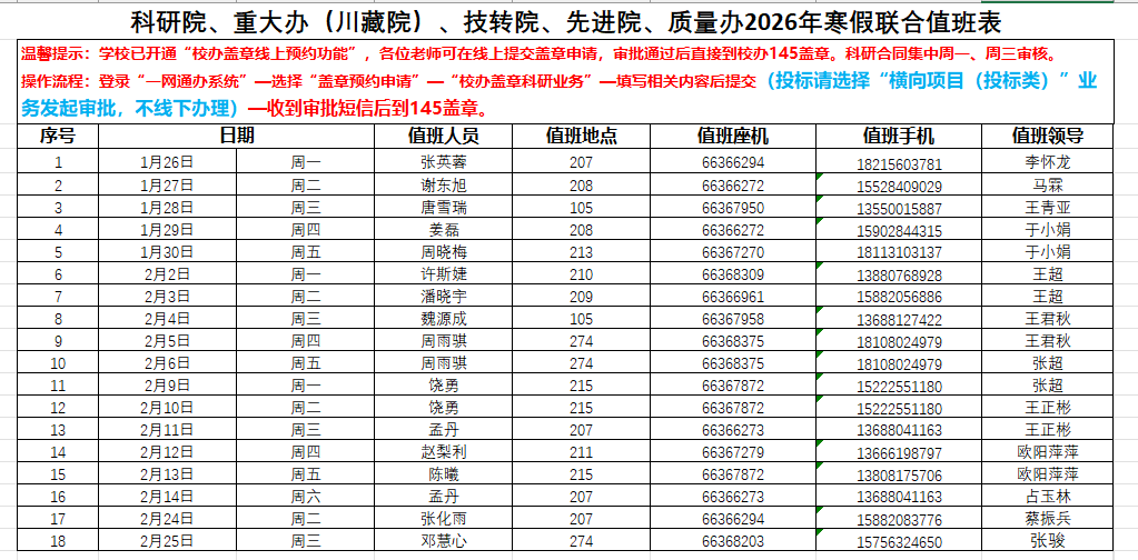科研院、重大办(川藏院)、技转院、先进院、质量办2026年寒假联合值班表